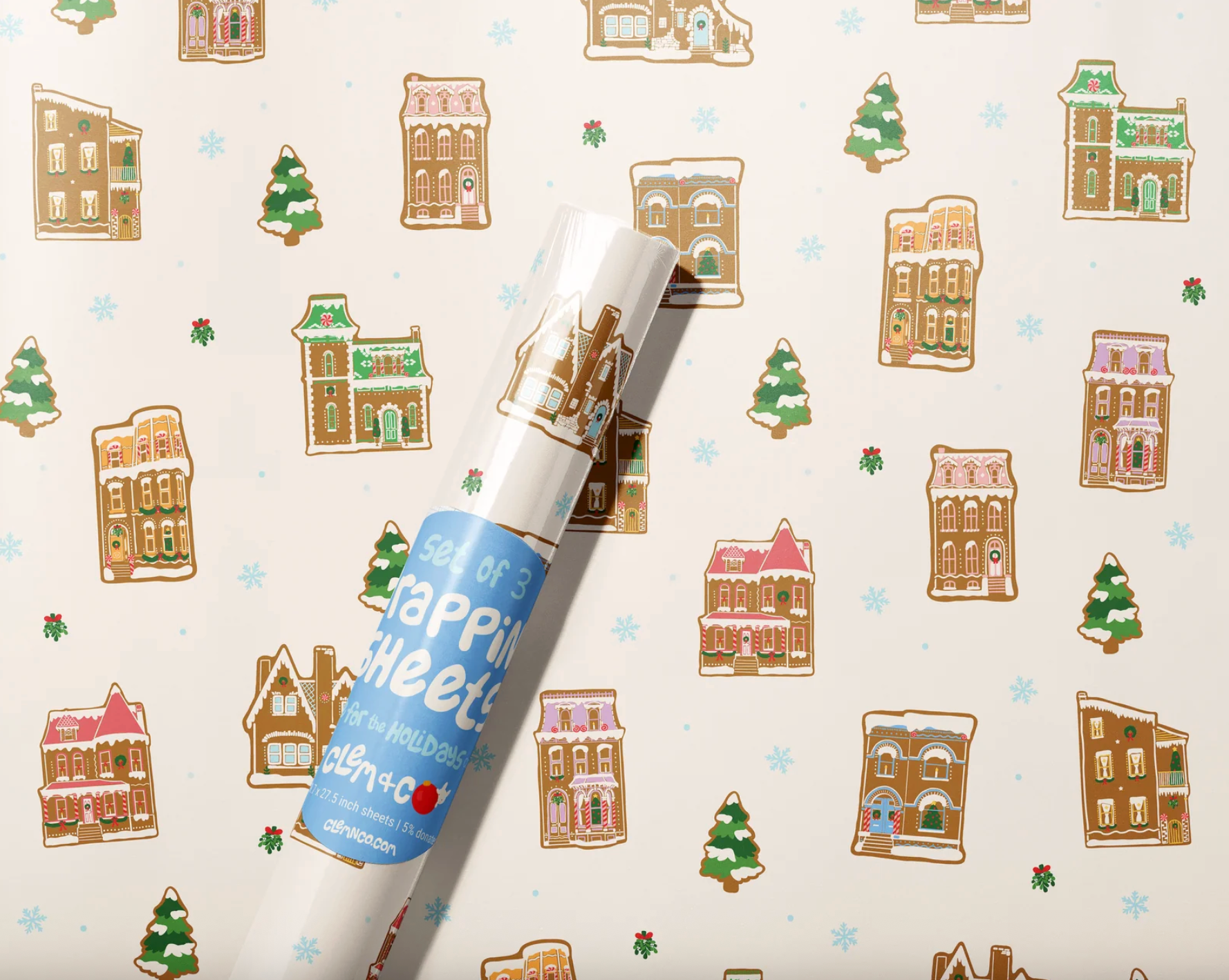 Clem the Bun and her friends love to look around at their city’s beautiful architecture, especially during the holiday season. To celebrate the architecture of all the homes, the buns hold an annual gingerbread house baking competition where they bake and decorate gingerbread house versions of their favorite homes across the city! Of course, these aren’t your typical gingerbread houses, but the buns go all in to represent the intricate design details of these stunning homes! And Clem wants people everywhere to enjoy their gingerbread houses, not just people in her hometown! They took Winnie the Bun's winning cookies from the competition and made wrapping paper for all to enjoy a little of the sugary sweet homes!