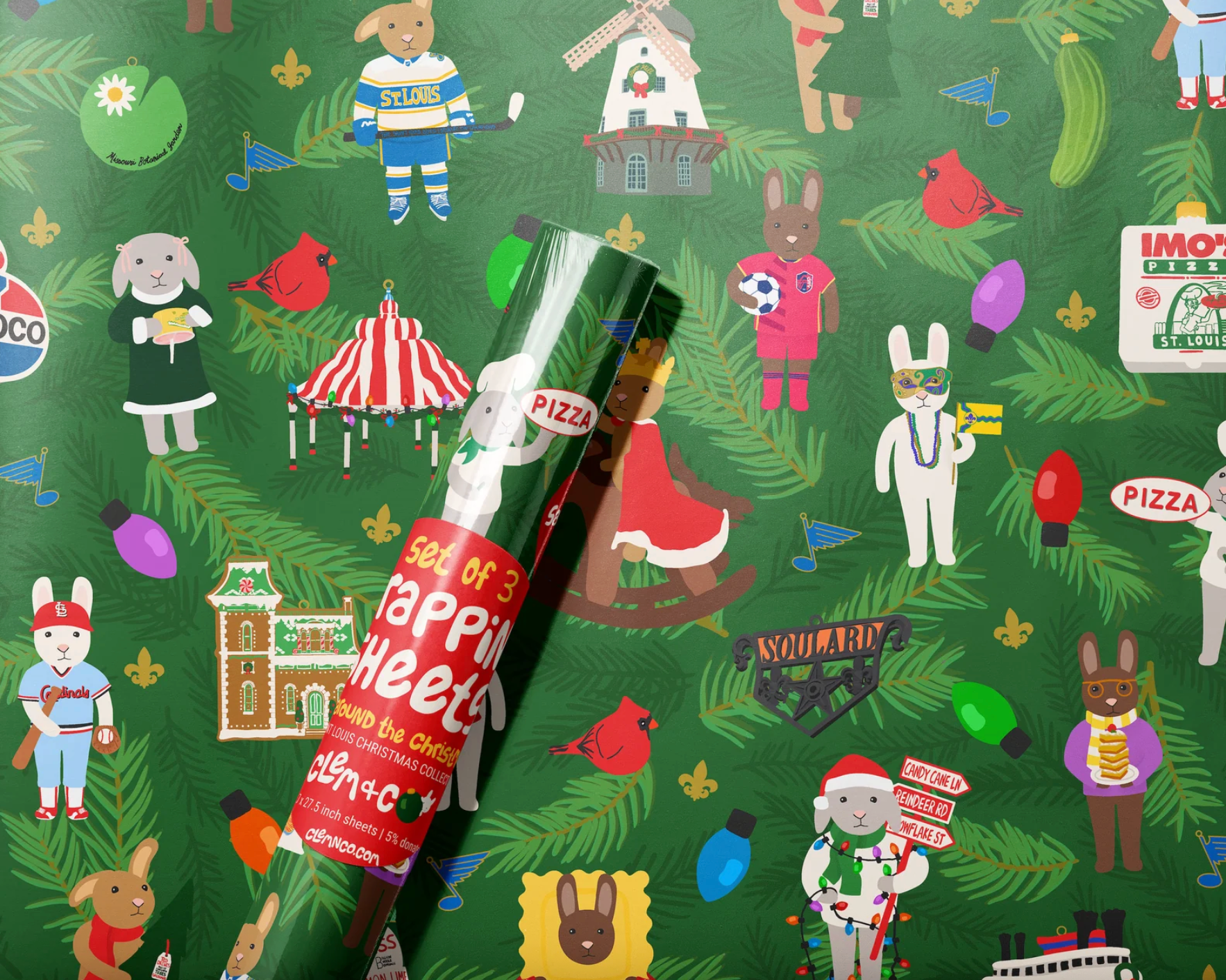 Clem the Bun & her friends are hoppin’ around the Christmas tree and decorating with all their favorite Saint Louis ornaments! From classic Saint Louis foods, like Imo’s, Ted Drewe’s, and gooey butter cake to the city’s iconic architecture and monuments, including the Arch, a Lafayette Square Home, Bevo Mill, and more! Clem ensured she represented as much as possible of her favorite city! Clem loves the tree they decorate every year so much, that she decided to share it with everyone in STL and make gift wrap so everyone can enjoy the holiday spirit, Saint Louis style!