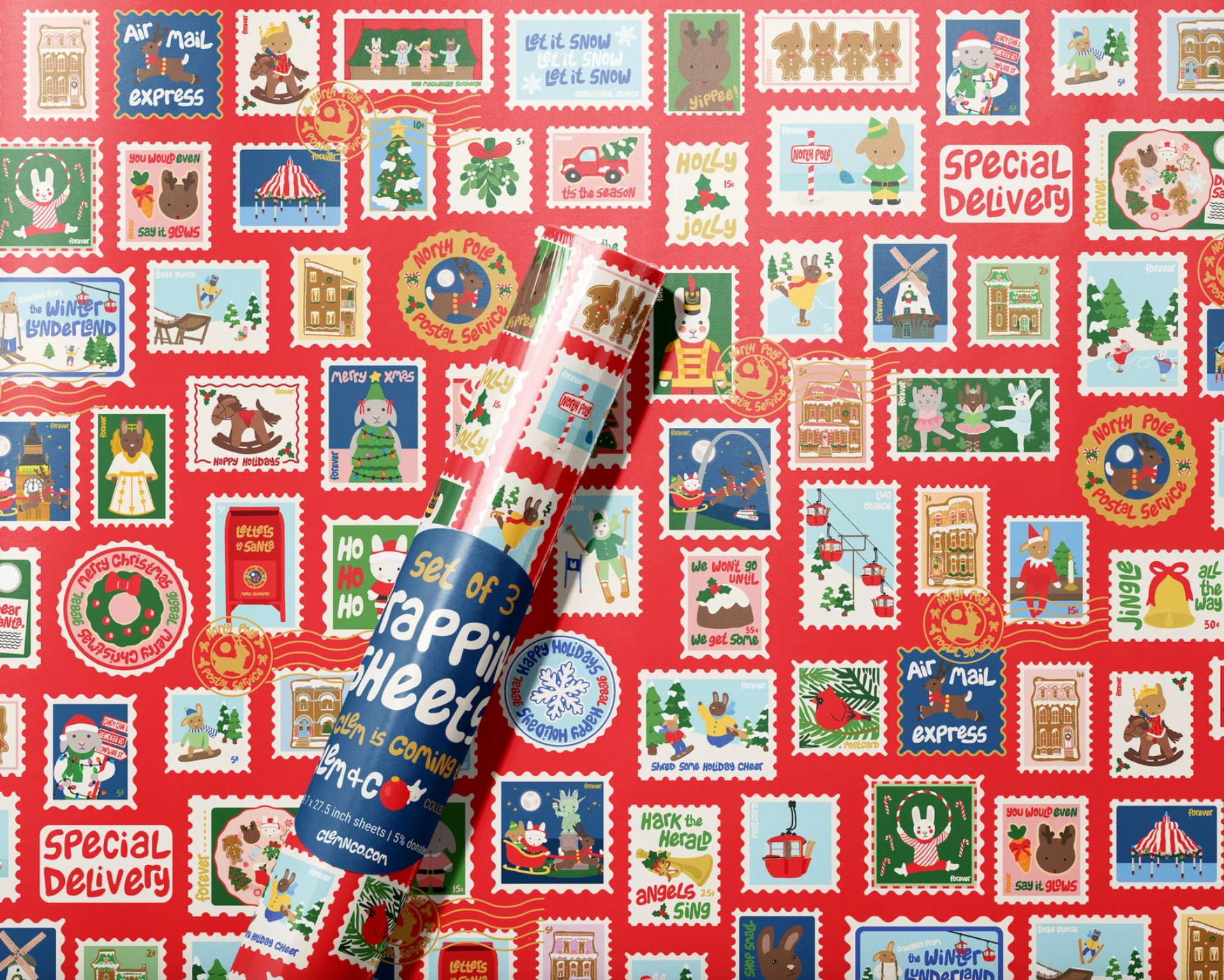 Santa Clem is Coming to Town to deliver the best gift wrap to all the good buns out there this Christmas, and all her friends are along for the sleigh ride! Luna the Red-Nosed Bun is here to help guide you in crafting gorgeously wrapped gifts that will surely make your loved ones glow (like a light bulb!). Claude, the Head Elf and resident artist, is responsible for bringing Santa Clem’s holiday gift wrap visions to life. Winnie is the baker of the bunch, whipping up Christmas treats beyond compare to keep the elves and Santa Clem’s bellies full during this busy season and has inspired so many of Clem & Co’s most delicious gift wrap designs! To get on Santa Clem’s Nice List  this year to get your hands on this one of a kind gift wrap, send a letter through the North Pole Postal Service and we’ll see what Santa Clem can deliver. Use one of Clem & Co’s stamps to send your letter, and the stamps even double as decoration, using all the designs from across each Christmas collection. They wanted a place where everyone could see a little of each collection, so they came up with this wrapping paper of stamps to show it all off!