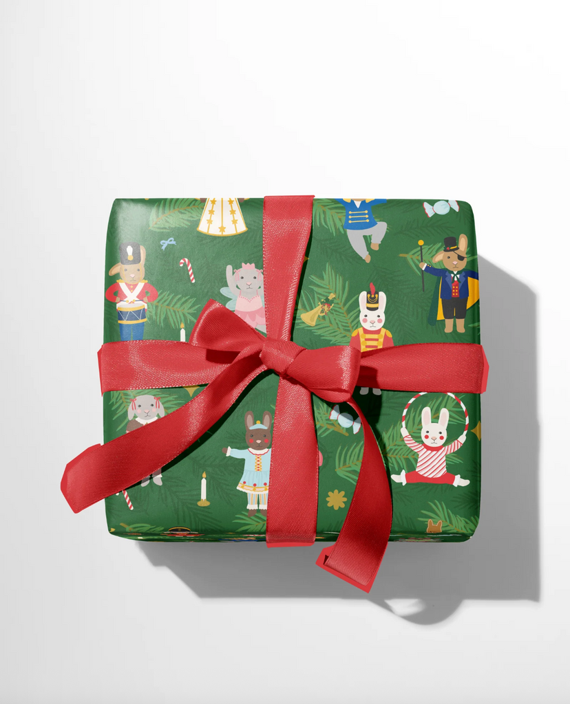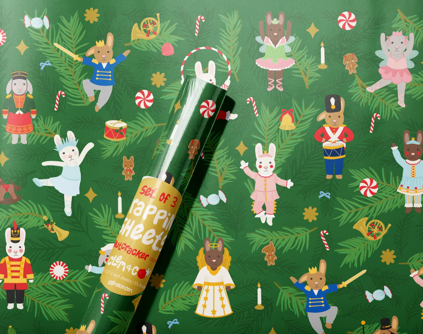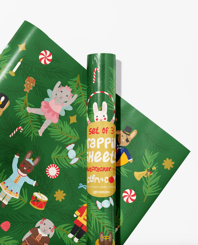 Set of 3 holiday wrapping sheets packaged in a roll with a label