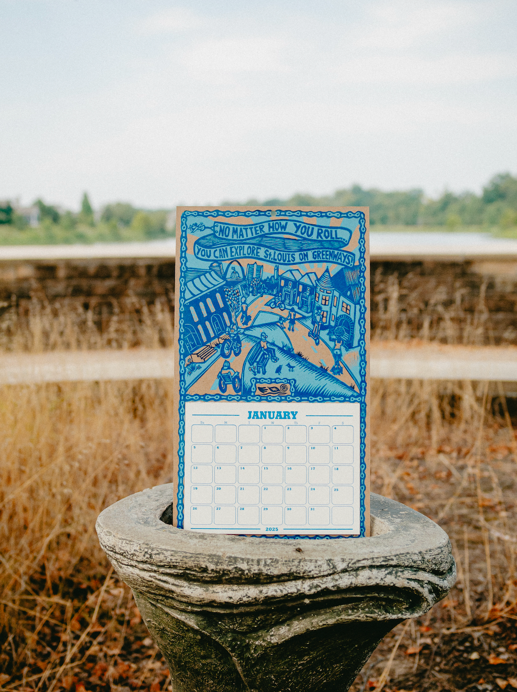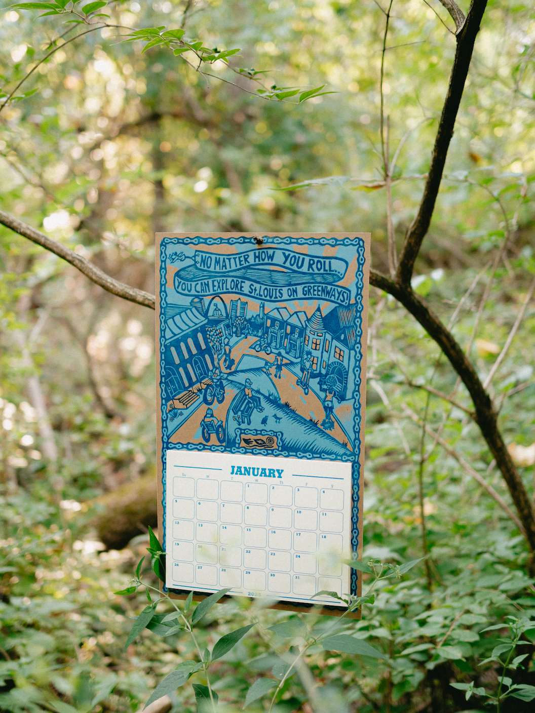Celebrate our local greenways year-round with this limited-edition woodblock print designed, carved, and printed by hand by Pete Holohan. Below the art you’ll find 12 tear-away calendar pages (Jan-Dec) to keep you organized and on-time in 2025. Printed from archival-quality inks on super heavyweight chipboard and assembled by hand, this print will be a keepsake long after the final calendar page is removed.