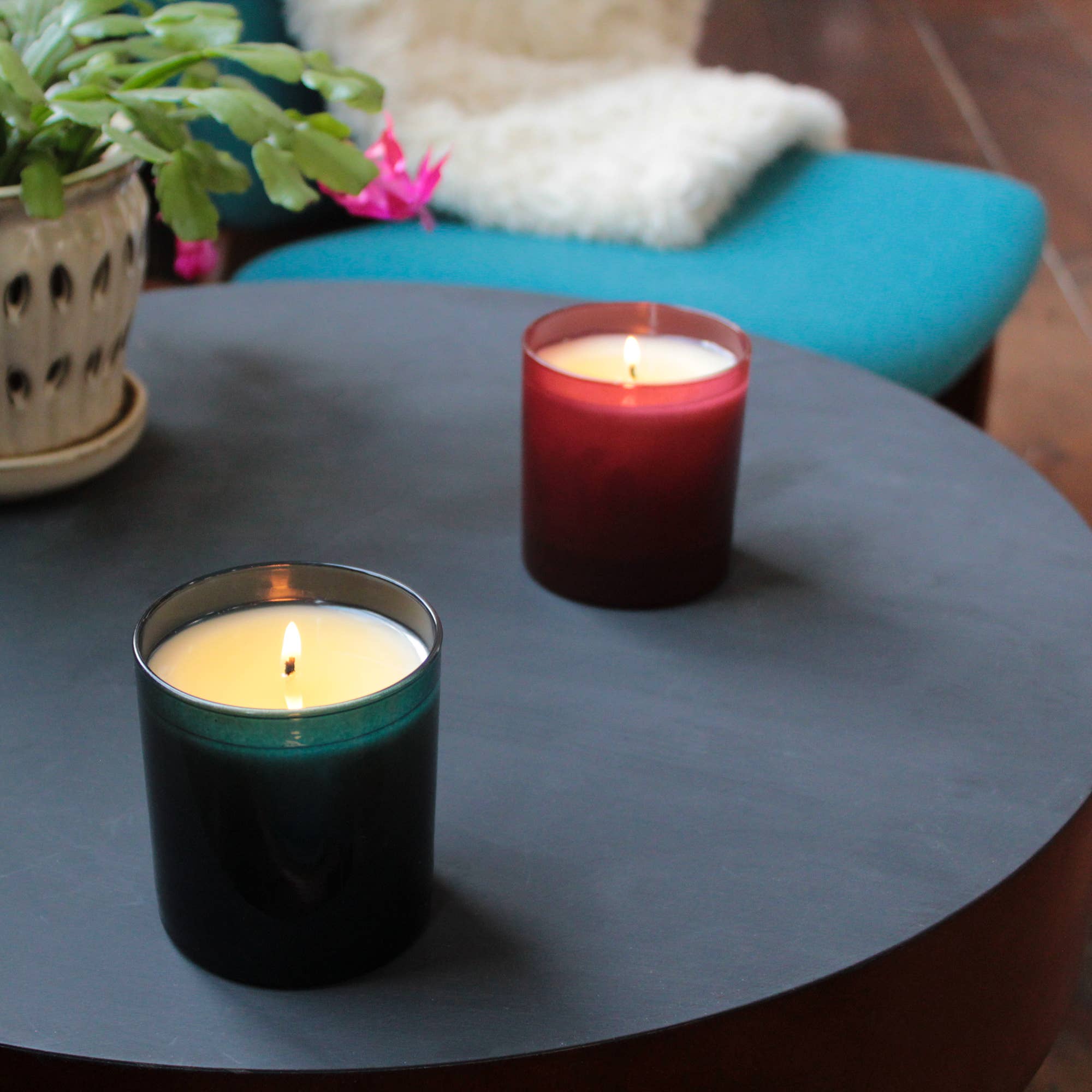 -9 oz. soy candle in a colorful translucent deep teal glass tumbler, packaged in a matching box.