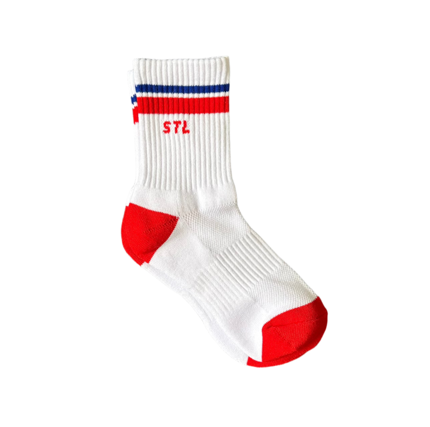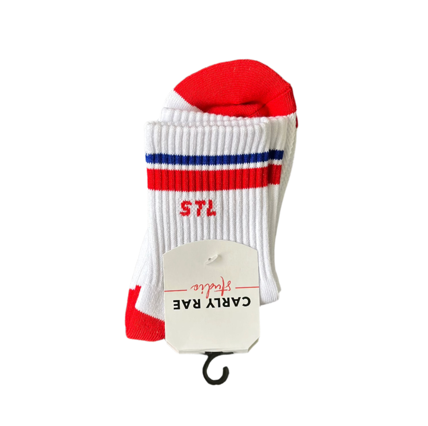 Embrace the vibrant spirit of St. Louis with Red & Blue Crew Socks from Carly Rae Studio. Inspired by the city's lively hues, these socks are a delightful blend of comfort and style. Crafted from a soft cotton blend, they ensure your feet stay cozy throughout the day. Designed to fit women's sizes 6-9 and men's sizes 4.5-8, they make a versatile addition to any wardrobe. The playful colors and whimsical design reflect Carly's love for patterns, nature, and sports. Enjoy a touch of artistic charm with every step you take!
