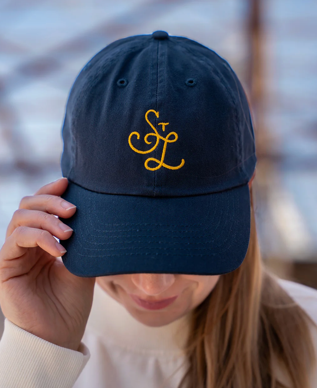 Extra soft, garment-dyed navy dad hat embroidered with our classic stl in golden yellow thread. Perfect for your St. Louis hockey fan!
