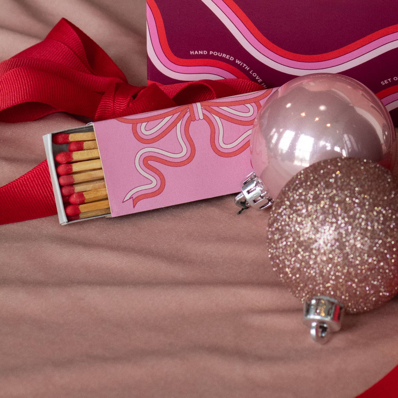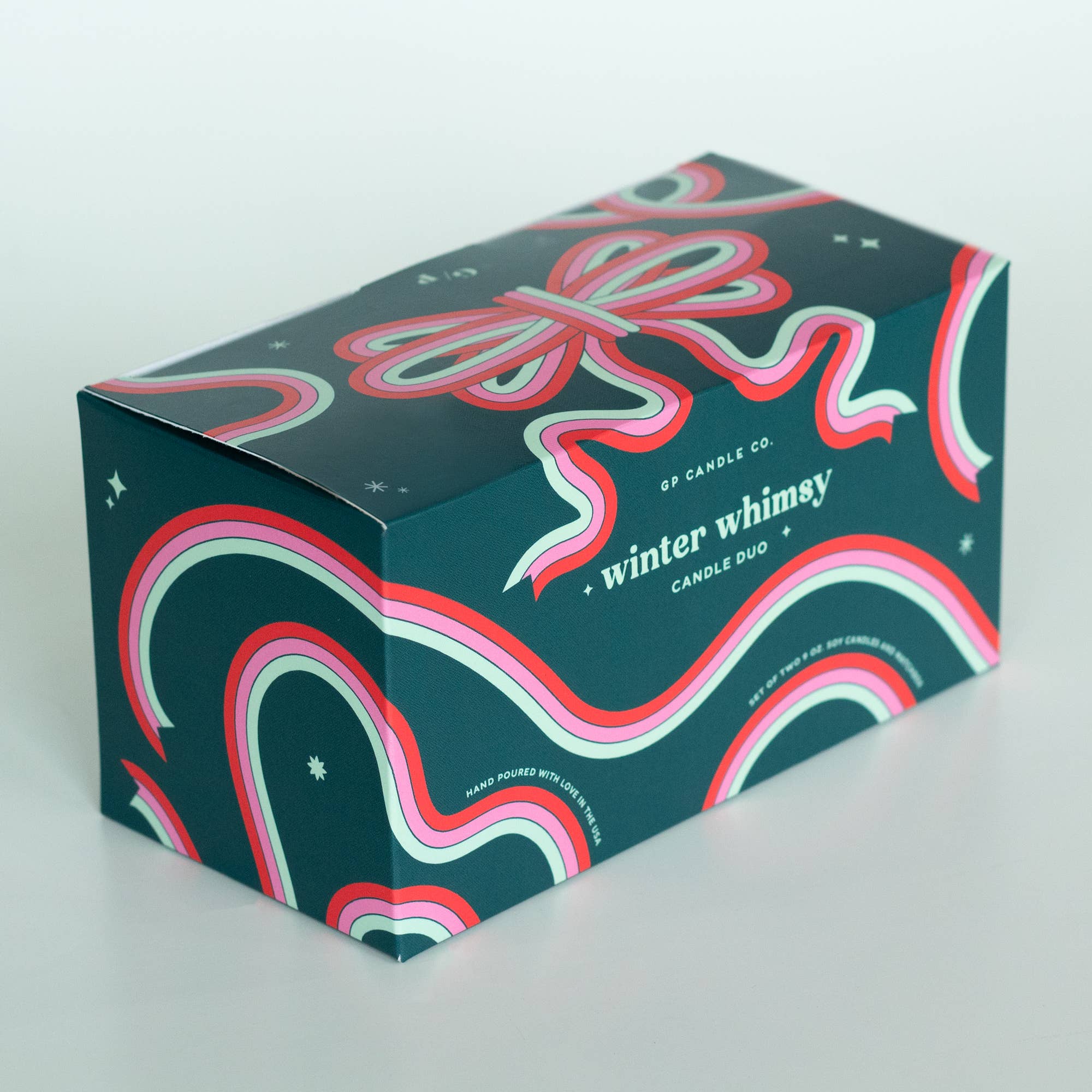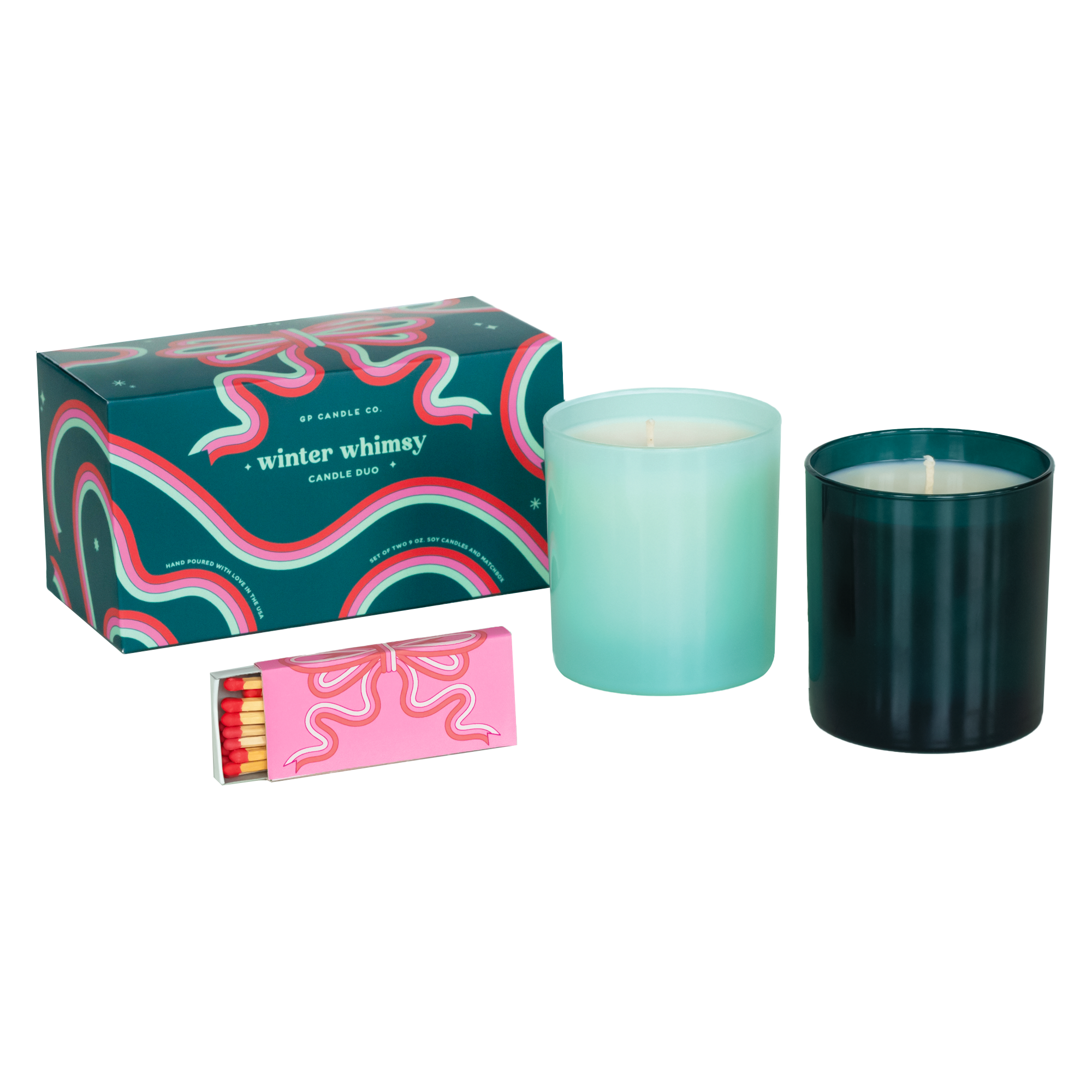 Beautifully boxed and ready to gift! Capture the magic of the holiday season with this festive gift box. The Winter Whimsy Candle Duo includes two 9 oz. candles, Solstice and Splendor, plus a 3" bow matchbox. Packaged in a deep teal, mint green, red, and pink bow patterned gift box. Solstice features a translucent deep teal glass tumbler with notes of fresh cut pine and wintergreen with blackberry and tangerine. Splendor features a translucent mint green glass tumbler with notes of blackcurrant, snowy balsam, sweet fig, and nordic cloudberry. Matchboxes feature a pink and red bow design. A sliding tray contains approximately 17 red tipped safety strike matches per box.
