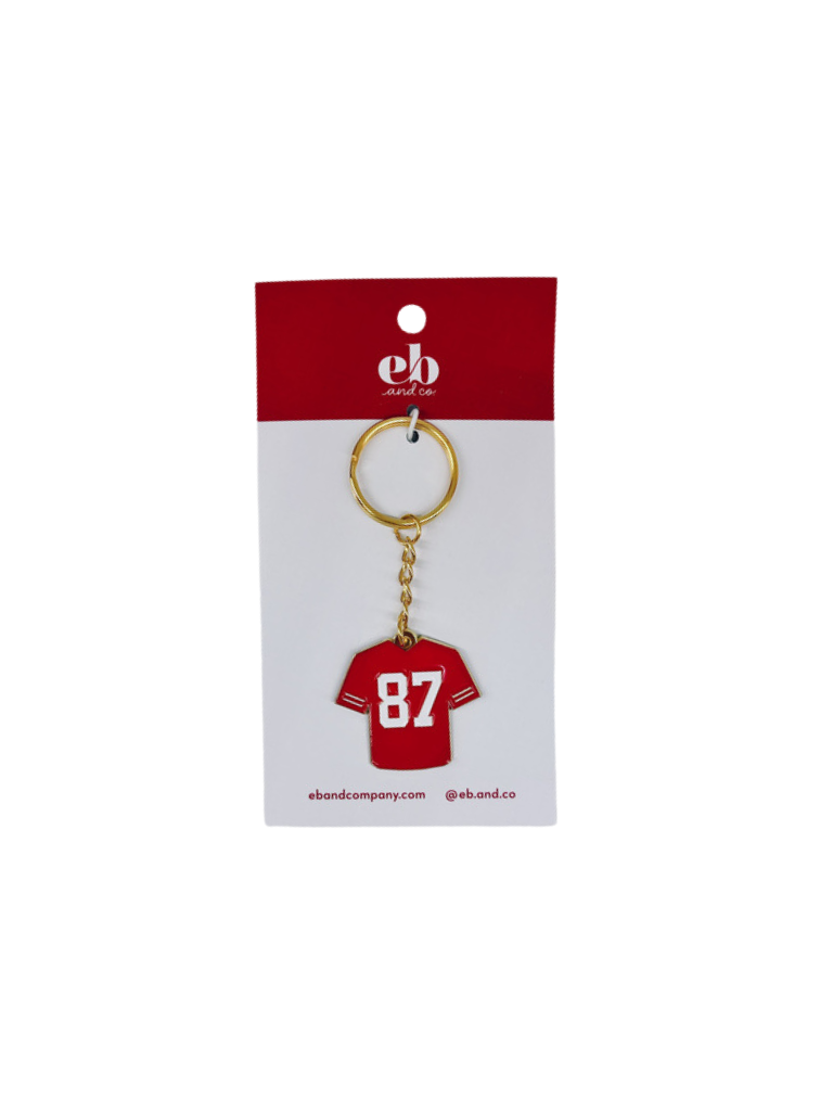 Introducing the Kansas City #87 Jersey Keychain from EB and Co., a symbol of your sports passion in a chic, everyday accessory. This original, exclusive design effortlessly merges practicality with style. Born from a quest for high-quality, affordable accessories, EB and Co. now extends its line to include this unique keychain. Just as Kansas City #87 makes remarkable plays, let this keychain make a statement about your unique style and love for the game. Carry a piece of the field with you wherever you go!