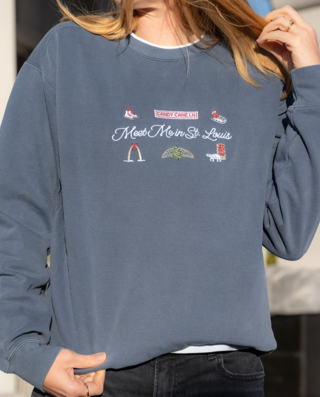 The Meet Me in St. Louis embroidered crew neck sweatshirt features so many of my favorite things to do in St. Louis around the holidays. This embroidered Comfort Colors sweatshirt is a washed denim color and features the Saint Louis Arch, the Zoo, the Botanical Garden's Garden Glow, Candy Cane Lane, ice skating, and sledding.