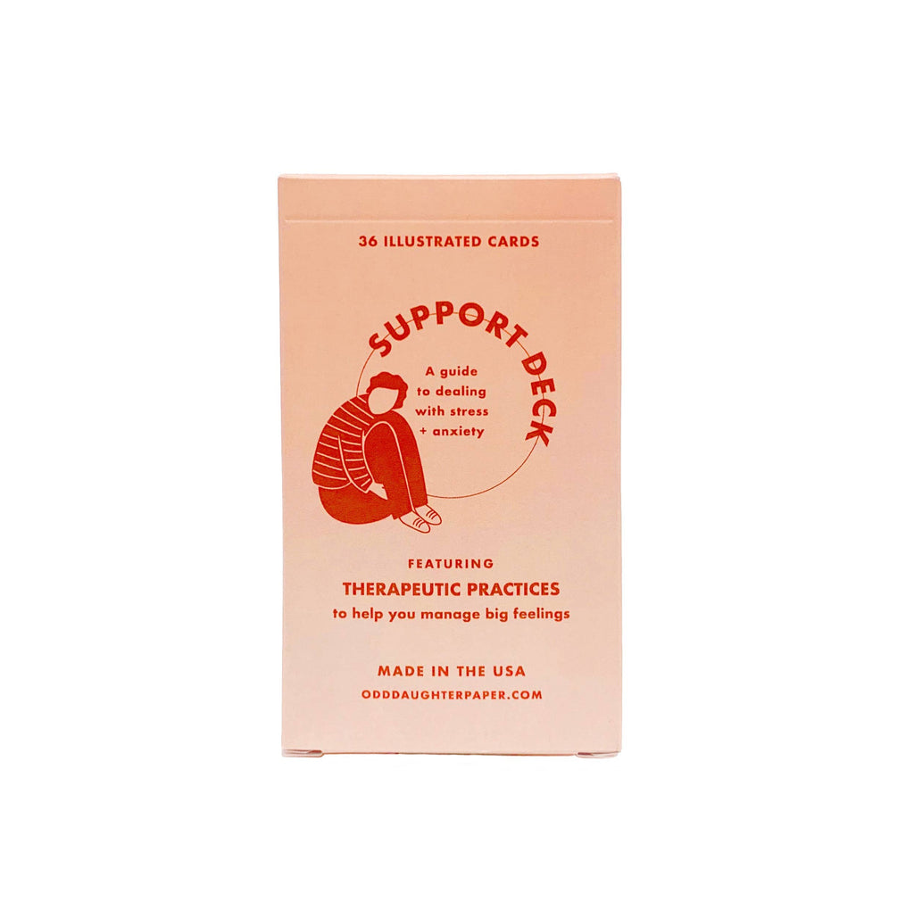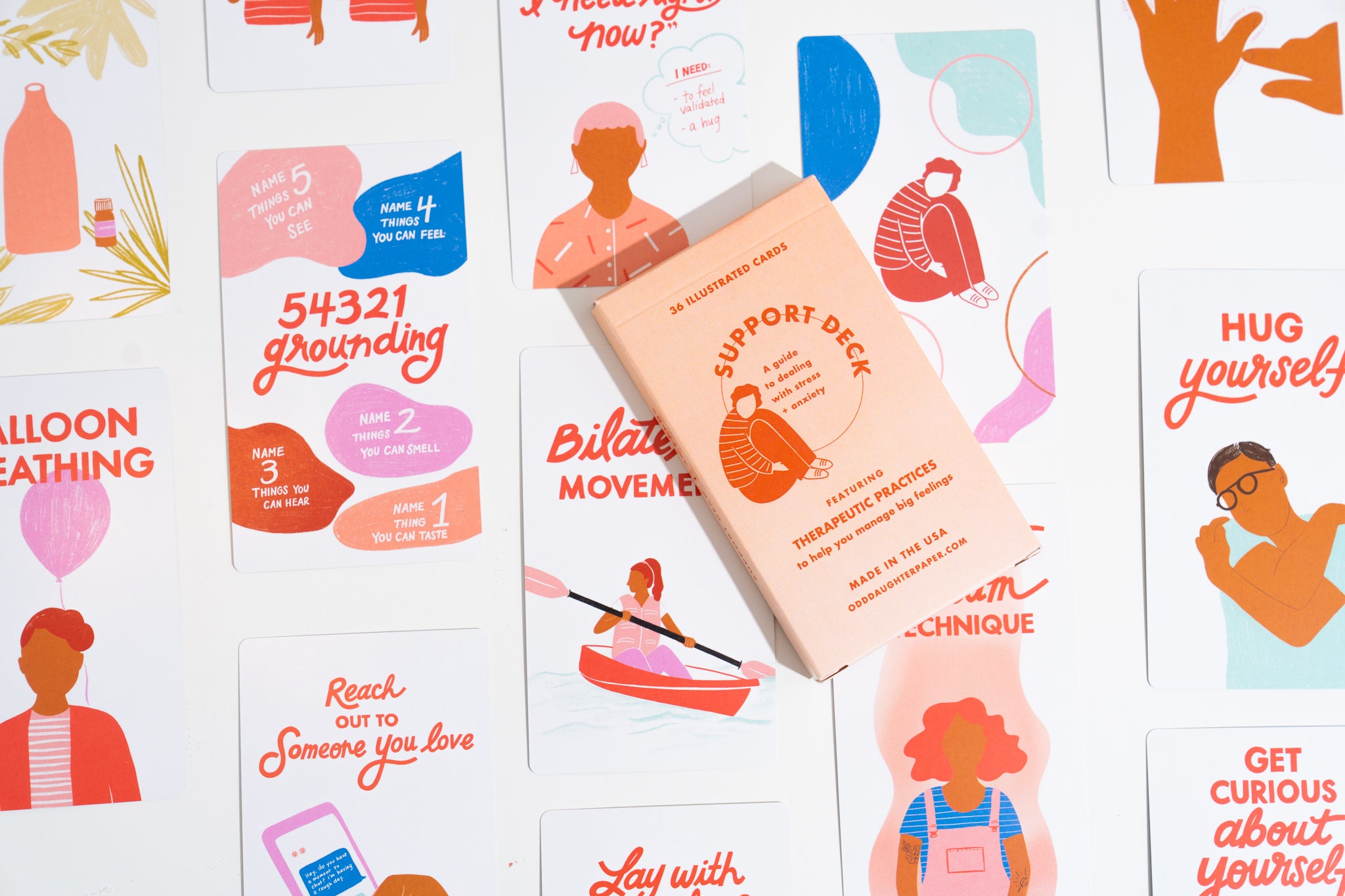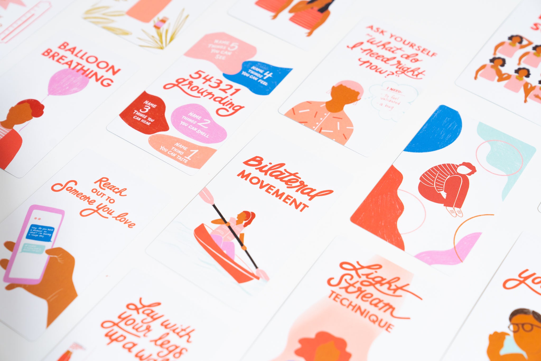 This deck was dreamt up by Katie Hart (illustrator) + Vanessa Trine (therapist). We both deal with anxiety in our daily lives and wanted to create a beautiful resource that you can use when you're feeling anxious, overwhelmed, grumpy, grief-stricken, depressed, angry, or just out of it. It can be so much harder to think clearly and strategically when our emotions show up in a big way. Since emotions are natural, we want to help process them safely instead of fighting them.