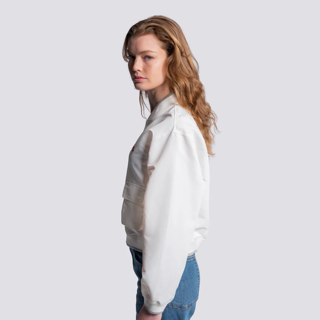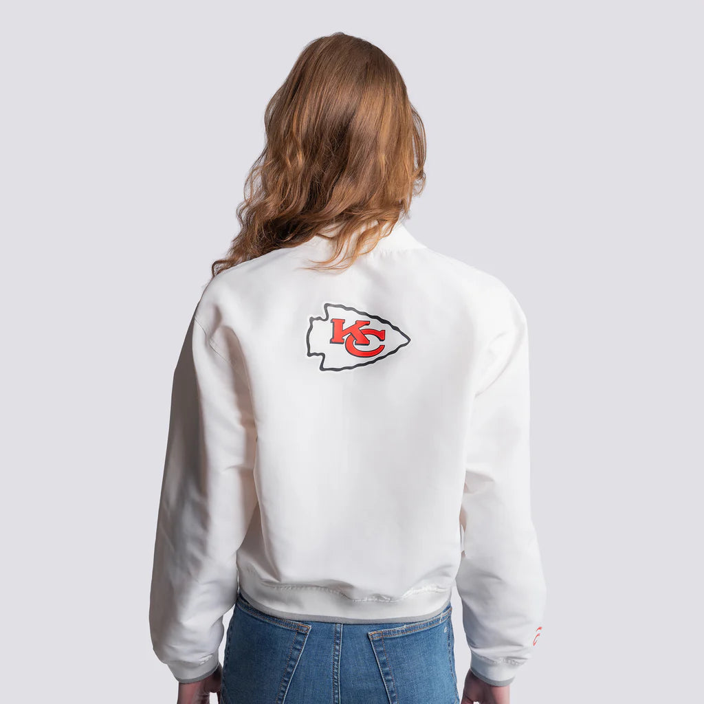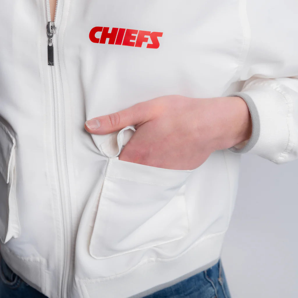 Stay stylish while showing off your Chiefs pride with the Paisley Bomber Jacket from the Lusso x Kansas City Chiefs collection. Designed for both fashion and function, this sleek white bomber features a minimalist aesthetic with bold CHIEFS embroidery on the chest. With a lightweight yet durable construction, utility-inspired pockets, and a zip-up front, this jacket is perfect for layering on crisp game days. Whether you're tailgating or hitting the town, Paisley keeps you looking fresh!