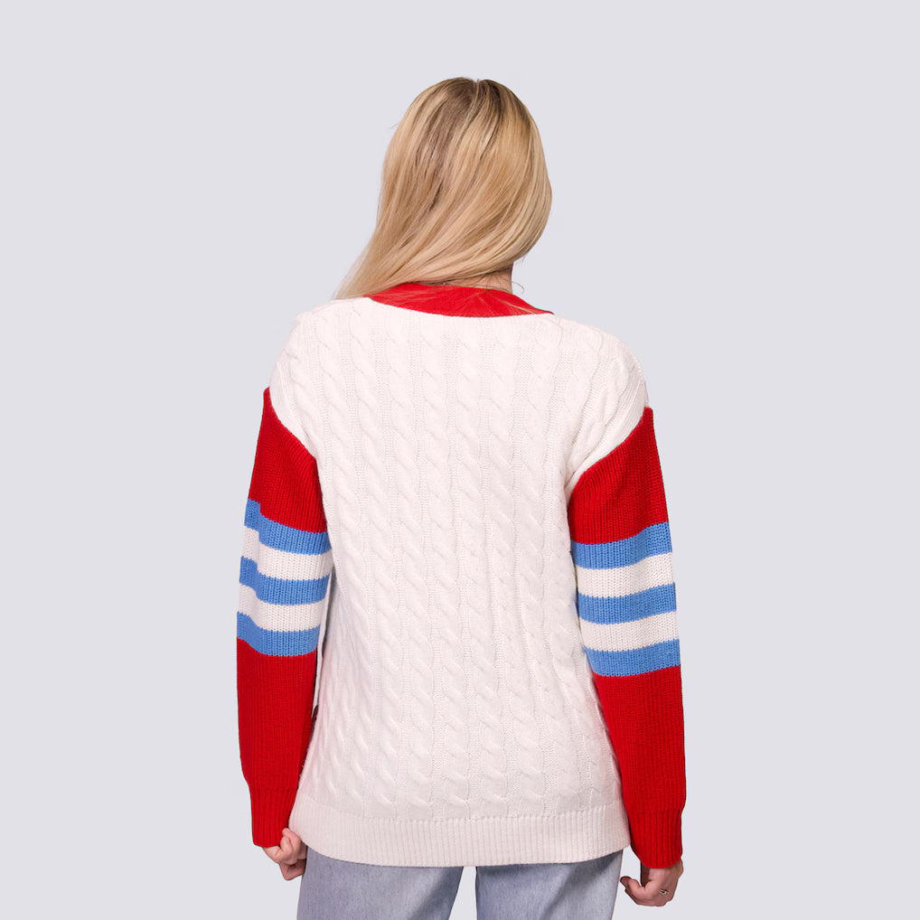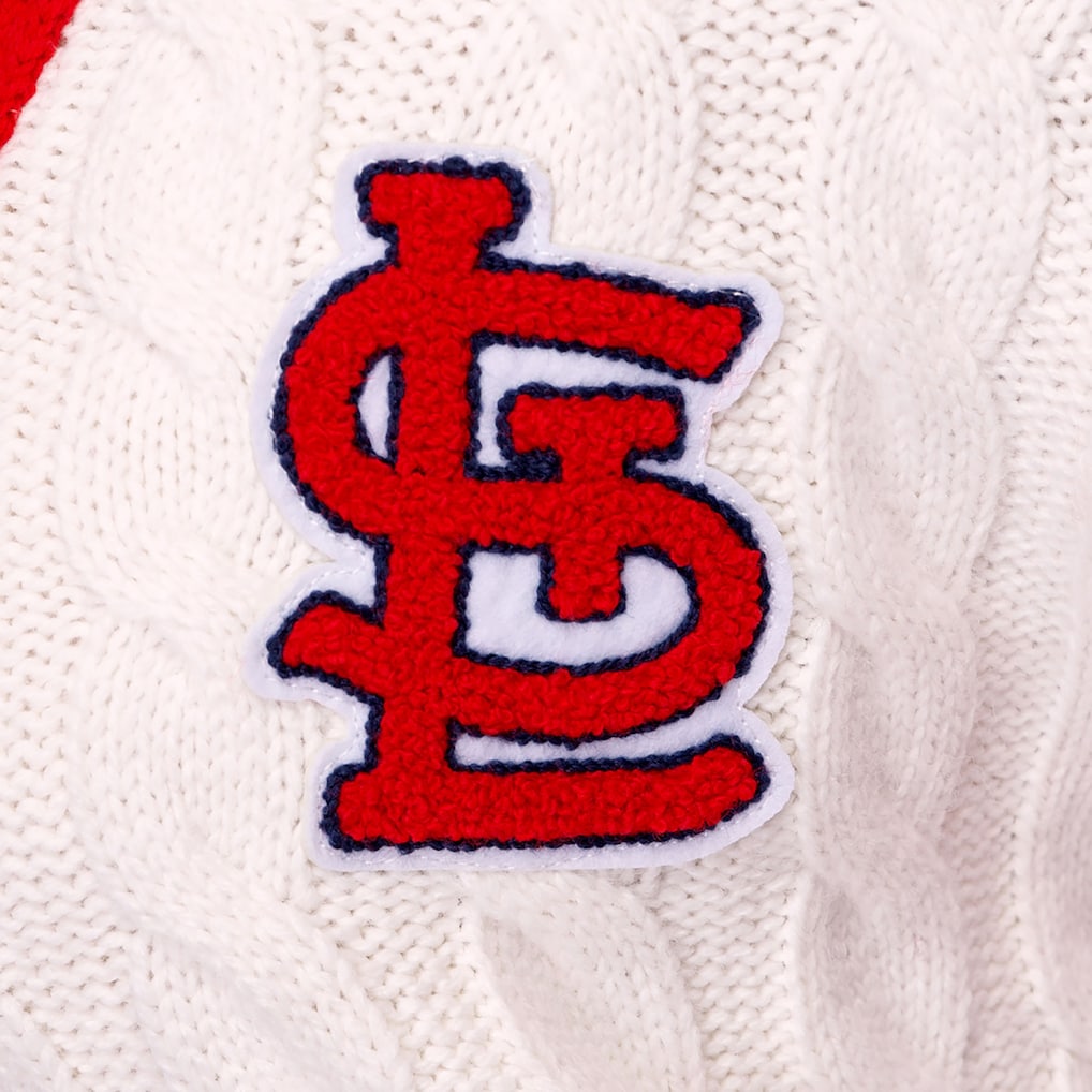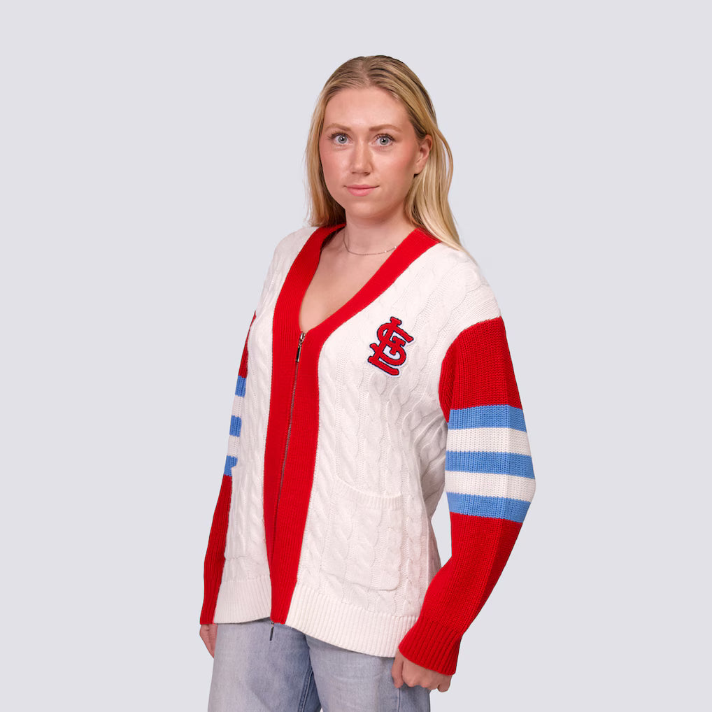 Show your unwavering support for the St. Louis Cardinals in any weather with this Shyla Knit V-Neck Full-Zip Sweater from Lusso. The relaxed fit ensures a comfortable and flattering silhouette, while the contrasting team colors on the sleeves add a touch of sporty flair. The sewn-on graphics patch at the left chest proudly displays your St. Louis Cardinals allegiance, making it the perfect layer for game day or any casual outing.