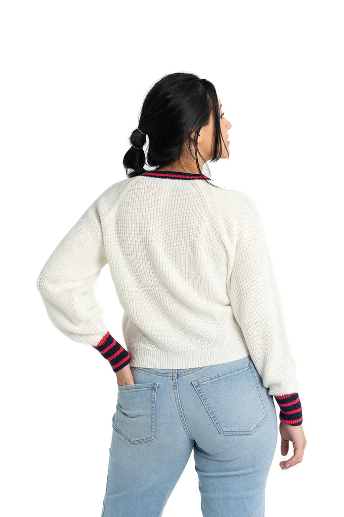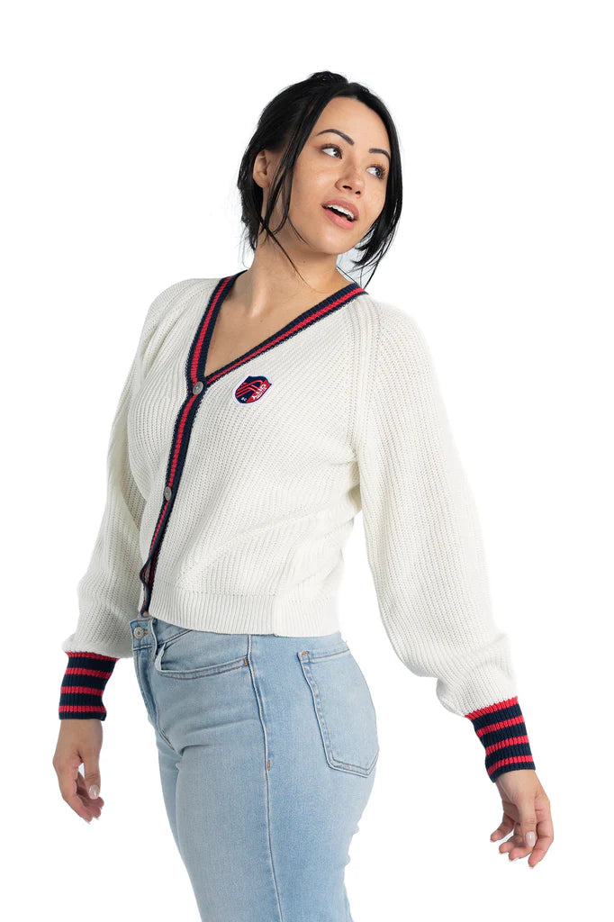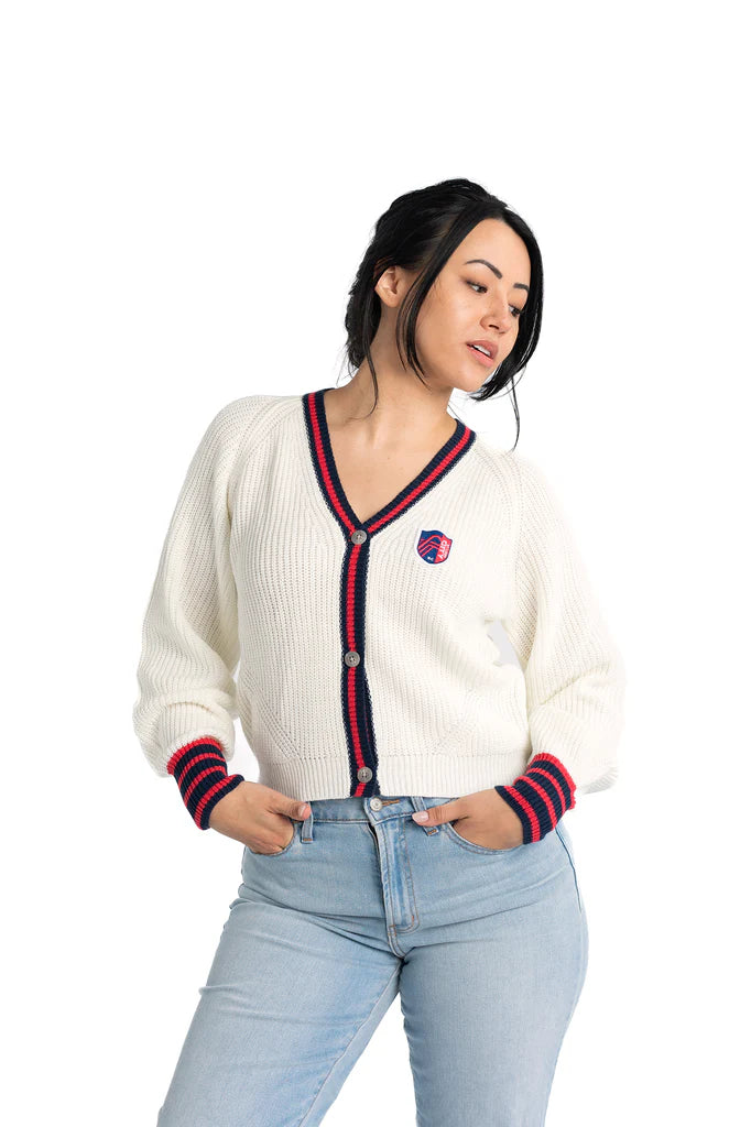 Designed with a bold MLB St. Louis City chenille team logo, this cardigan features striped trim for a sporty touch and faux horn buttons for added sophistication. The puff sleeves with an extended cut elevate the look, making it a standout piece for game days or everyday wear.