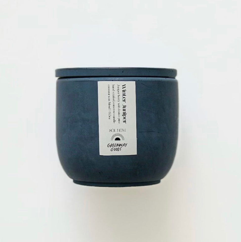 Winter Juniper Candle: Juniper berry with festive pine transports you to our local greenways.  Made with coconut wax for a clean burn up to 35 hours.